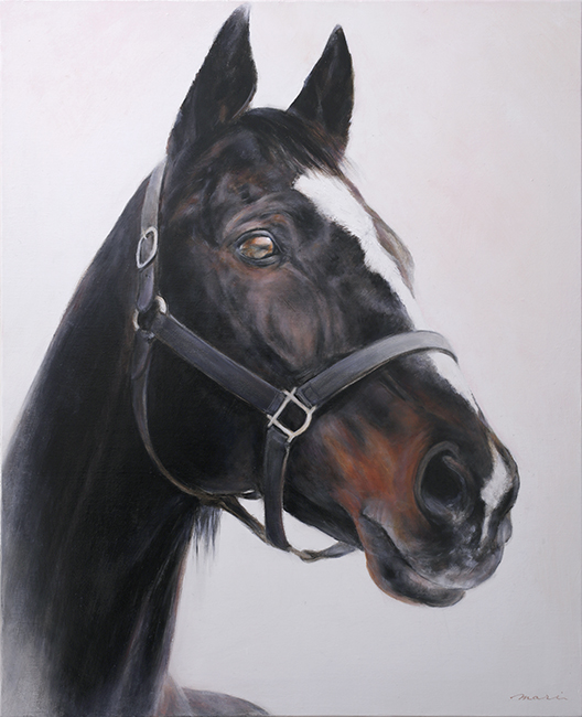 立ち姿、頭部肖像、ウォーキング風景、放牧風景と、コントレイルを描くのは8作目。一度は描いてみたかった「鬣」を靡かせて疾走する、この放牧風景。