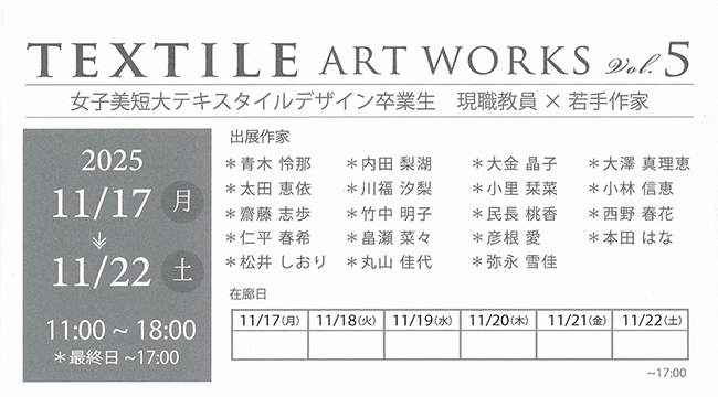 女子美術大学短期大学部 造形学科 テキスタイルデザインを卒業した若手作家と現職教員によるグループ展です。 |