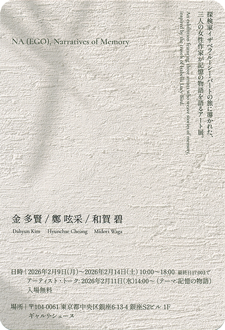 | 本展〈ナ(我)、記憶の物語〉は、探検家イザベラ・ルーシー・バートの旅に導かれ、三人の女性作家がそれぞれの視点から記憶の物語を語るアート展である。移動と観察の記録として綴られた紀行文を起点に、作品は外部の風景だけでなく、日常の中に静かに蓄積される時間や内側に留まる感覚へと視線を向ける。本展は、複数の時間と視点が折り重なって形成される「記憶」を、静かに辿るための場である。 NA (EGO), Narratives of Memory is an exhibition featuring three artists who weave narratives of memory, inspired by the travels of Isabella Lucy Bird. Taking travel writings-records of movement and observation-as its point of departure, the exhibition turns its gaze not only toward external landscapes but also toward time quietly accumulated in everyday life and sensations that remain within. The exhibition offers a space to gently trace "memory" as something formed through the overlapping of multiple times and perspectives. 金 多賢/Dahyun Kim 映像クリエイター/女子美術大学芸術学部准教授記憶の変容をテーマにした映像インスタレーション作品を手がけている。 本作では、イザベラ・バードによる『朝鮮紀行 Korea and Her neighbours』の記録を手がかりに作家自身の幼少期の記憶と重ね合わせながら、記憶の連なりや創造から立ち上がる物語を可視化する。 Media Artist / Associate Professor, Faculty of Art and Design, Joshibi University of Art and Design The artist creates video installation works that explore the transformation of memory. In this work, She draws on the records of Korea and Her Neighbours by Isabella L. Bird, overlaying them with her own childhood memories. Through this process, the work visualizes narratives that emerge from the continuity of memory and acts of imagination. 2006 韓国国立順天大学映像デザイン専攻 卒業 2014 筑波大学大学院博士後期課程修了 2014-2017 女子美術大学アート・デザイン表現学科 助手 2018 女子美術大学アート・デザイン表現学科 助教 主な展示 2020 「ナ(我)、 とても個人的な話」 3331 Art Chiyoda (東京) 2019 「線、 つながる」 ギャルリ ー・ジュイエ (東京) 2015 「助手展」 Joshibi SPACE 1900 (神奈川) 2006 BFA, Visual Design, Sunchon National University, Korea 2014 PhD, University of Tsukuba 2014-2017 Research Assistant, Department of Art and Design Expression, Joshibi University of Art and Design 2018 Assistant Professor, Department of Art and Design Expression, Joshibi University of Art and Design Exhibitions 2020 Na(EGO): A Very Personal Story, 3331 Arts Chiyoda, Tokyo 2019 Lines: Connected, Galerie Juillet 2015 Assistant Exhibition, Joshibi SPACE 1900, Kanagawa 鄭 呟采(チョン・ヒョンチェ)/Hyunchae Cheong 韓国出身のデザイナー/アーテイスト。 2019年、多摩美術大学大学院にて博士号(芸術)を取得。 デザインコンサルティング会社 kenma にてデザイナーとして活動した後、サムスン電子ジャパン株式会社にてクリエイティブ・ディレクターを務める。 現在は、多摩美術大学大学院美術研究科にて助教(Assistant Professor)として、研究と教育を並行して行っている。 制作と研究を通して、デザインの可能性を探究している。 Hyunchae Cheong is a designer and artist from South Korea who received her PhD in Art from Tama Art University in 2019. After working as a designer at the design consulting firm kenma, she served as a Creative Director at Samsung Electronics Japan. She is currently an Assistant Professor at the Graduate School of Art and Design, Tama Art University, where she engages in both research and education. Through practice and research, her work explores the potential of design. 2013 韓国東明大学デザイン学科視覚デザイン専攻卒業 2016 多摩美術大学大学院美術研究科博士前期課程デザイン専攻修了 2019 多摩美術大学大学院美術研究科博士後期課程美術専攻修了、博士号(芸術)取得 2019 デザインコンサルティング会社 kenma、デザイナー 2019-2022 サムスン電子ジャパン株式会社、クリエイティブ・ディレクター 2022-現在 多摩美術大学大学院美術研究科、助教 主なグループ展 2024 「東京ミッドタウン・デザインハブ第111回企画展デザインの風が最初に触れる場所」 TUB (東京) 2022 「多摩美術大学TUB第20回企画展デザイン人類学宣言!」 TUB (東京) 2020 「ナ(我)、 とても個人的な話」 3331 Art Chiyoda (東京) 2020 「KWVD International Invitational Exhibition 2020」 Online (ソウル・韓国) 2013 B.A. in Visual Communication Design, Department of Design, Tongmyong University, South Korea 2016 M.F.A. in Design, Graduate School of Art and Design, Tama Art University, Japan 2019 Ph.D. in Art, Graduate School of Art and Design, Tama Art University, Japan 2019 Designer, Design Consulting Firm kenma 2019–2022 Creative Director, Samsung Electronics Japan 2022–Present Assistant Professor, Graduate School of Art and Design, Tama Art University Selected Group Exhibitions 2024 "Where the First Breeze of Design Touches Tokyo Midtown Design Hub, 111th Exhibition", TUB, Tokyo 2022 "Declaration of Design Anthropology! TUB 20th Exhibition", TUB, Tokyo 2020 "NA (EGO): A Very Personal Story", 3331 Arts Chiyoda, Tokyo 2020 "KWVD International Invitational Exhibition 2020", Online, Seoul, South Korea 和賀 碧/Midori Waga 資料や文献に残る記録をもとに、自然物や古民具、自身が作る彫刻などを交えて、記憶と記録の在り方を探る作品を制作。 2006 University of London Goldsmiths college, BA History of Art 卒業 2014 多摩美術大学